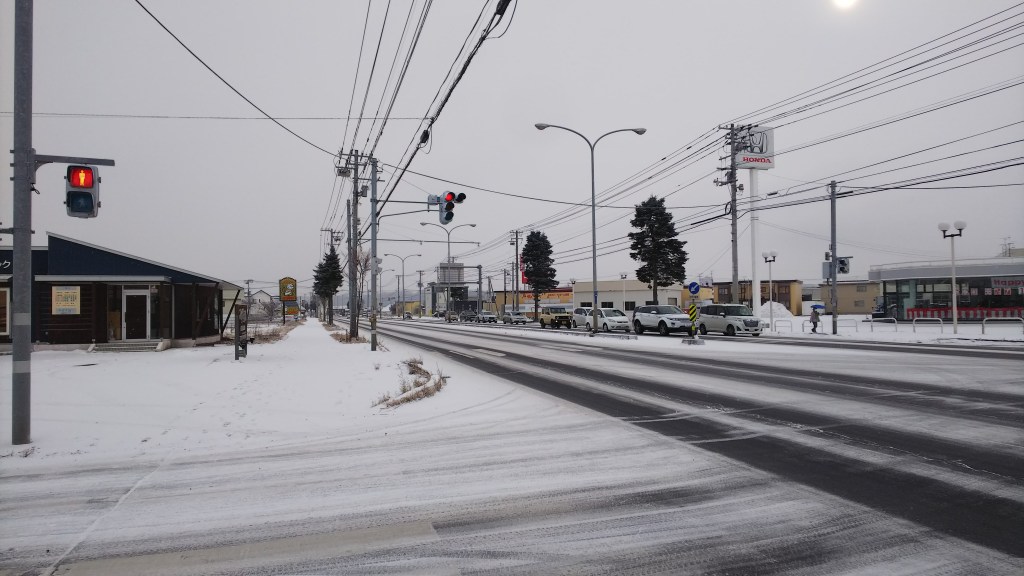 最初はアスファルトが剥き出しだった道も、次第に雪が積もり始め雪も降ってきた。